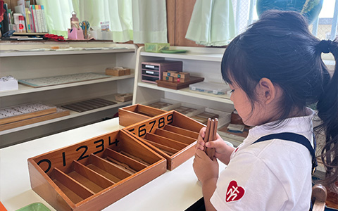 「モンテッソーリ活動」は、日常生活、感覚、数、言語、文化の五領域に分かれていて、どれも子どもたちが、自分自身をつくり上げていく為に、